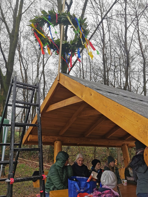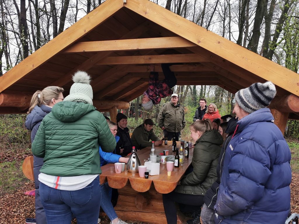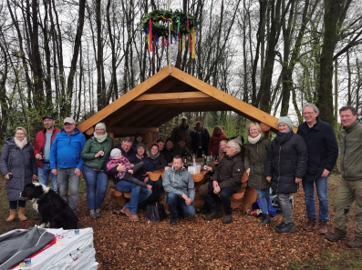 Zum Richtfest waren auch die Mitglieder der Projektleitung seitens der Bürgerstiftung REH - Peter Stöbel, Ute Heidermann-Rösler und Rita Grömping – herzlich eingeladen. Mit einem klassischen Richtspruch, vorgetragen von Markus Büsken, wurde die Hütte feierlich eingeweiht.